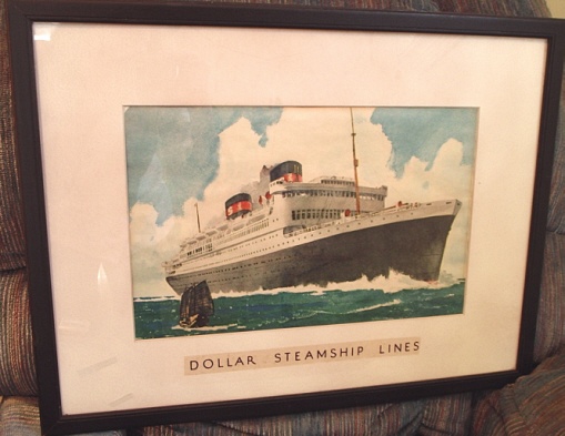 Above is a framed print depicting the SS President Hoover of the Dollar Steamship Lines. The SS President Hoover, and the nearly identical SS President Coolidge were built in 1930 and 1931, respectively, for Dollar Steamship Lines through a US Maritime Commission plan inaugurated in 1928 to fund new US-built, US-registered shipping. These two ships were the largest ocean liners built in the United States until that time. THE PRINT is identifiable easily, as numerous post cards with this same image exist and which are labeled as SS President Hoover (lead ship of the two-ship class) on the rear, with some particulars on the ship. This is a very large print of the same artwork. The frame is approximately 25-5/8 by 19-5/8 inches, and is furnished with a custom-labeled matte. Notable in this illustration is the smallish sampan passing the Hoover; this identifies the ship as a denizen of the Pacific Ocean, which of course the Dollar Steamship Lines and affiliates were. The frame is very austere, which is to be expected given the completion of the ships after the start of the Great Depression. |