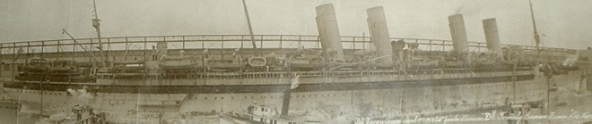 ABOVE, a detail view of the ship cropped to fit. The KRONPRINZESSIN CECILIE was originally owned by the North German Lloyd Line (Norddeutscher Lloyd in German) and was the fourth and last four-stacker of that line. (This company's major competitor in Germany was Hamburg-America which built only one four-stacker with which to compete.) These large and expensive ships were really intended to gain notoriety for the largest German shipping lines, and shipbuilding, over the British and to get the Blue Riband for transatlantic speed away from the British. This they did (although the British got it back later) but what they really did was launch the era of the "Super-Liner" and of course being the first four-stack ocean liners ever built they also started the notion that four stack ships were the biggest, best and safest group (which of course has nothing to do with the number of stacks, per se.)
