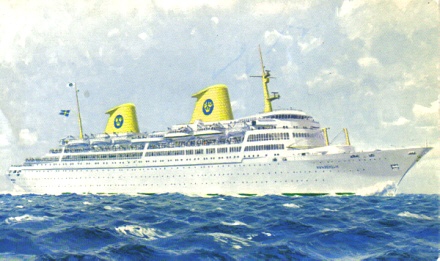 We have to start somewhere; that is, we have to leave someplace in order to get some OTHER place to go on vacation! The sky, and the sea in this view make it seem as if Swedish-American Line's SS KUNGSHOLM is outbound toward a vacation spot -- or many spots. The card says that the ship was in service both on cruises to all five continents and was also in service operating as a liner between Copenhagen / Gothenburg and New York. This impressive looking ship was actually diesel-powered, was the third ship (of four!) to carry this name for this owner and was completed in 1953 specifically to operate in exactly the kind of combination service described above. 660 feet long, 26,000 gross rated tons. |