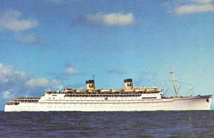 Above, a post card covering both SS SANTA ROSA and SS SANTA PAULA, sisterships, of the US-flag Grace Line. Built by Newport News Shipbuilding in 1958, with geared turbine propulsion. This card was mailed in 1968. The card itself says it best: "These ultramodern 20,000-ton sister luxury liners, air-conditioned throughout and stabilized for cruising comfort, were expressly designed and built to serve the Caribbean. They sail weekly on 13-day cruises from New York to colorful ports of the Caribbean, South America, and Florida. U.S. Flag ships built and operated to strict U.S. safety standards." What can I add to that -- other than just look at all the vacation iconography present in this card. The beautiful lines of the ship, incorporating both classic liner and modern elements are notable. |