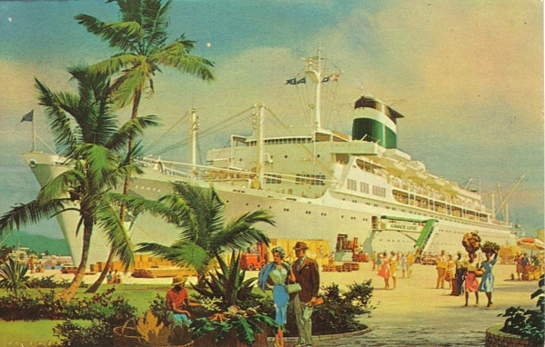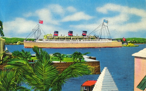 Of course there are Caribbean destinations for vacation, or for "holiday" and here we see the beautiful SS QUEEN OF BERMUDA, Furness, Withy & Co. Line in Hamilton Harbor, Bermuda. This ship was built in 1933, and was one of a number of ships of that era to include turbo-electric drive. It seems that this ship may have been very specially designed for frequent trips to the islands, with docking and maneuvering; not only did turbo-electric drive make speed control and reversal easier, but on this ship four screws were fitted with a total shaft horsepower of only about 19,000. This was easily achievable on two, but with rocky harbors smaller screws would keep draught shallower and would allow easier maneuvering with the spread of the screws closer to the ship's sides. Forgetting all that- look at the scene! I'm ready to go right now. |