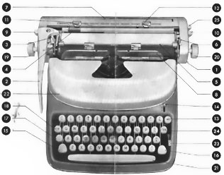 At right, overall plan view of a post-1960 machine. These differ, again, in very small respects. One notable feature of Alpina machines is that, while they employ carriage shift, only the platen actually moves when the shift keys are depressed. This makes shifting rather easy considering the size and weight of these machines -- these are among the very biggest and heaviest portables in the post-1958 enlarged overall size. |
