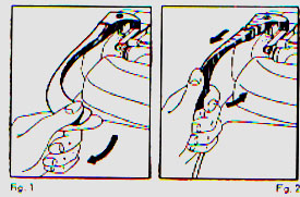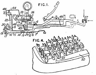 The Alpina DT33 and variants thereof contain one highly original feature. On these machines, the lowest row of keys not only depresses normally, but also pushes in and in so doing actuates the various stops for the decimal tabulator. The markings for the stops are found on the space bar, right below each key. On the left is original patent material for this feature; note the keytop, (27) with arrows to indicate both vertical and horizontal motion. |