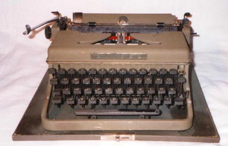 The alterations in the product line are confusing, but seem to center around the above mentioned change in 1952 and another in 1958. Some machines were larger in overall size, and alterations were made in keyboard arrangement. Key-set tab stops were also now available. At left, my Alpina, s/n 134,564 dating to 1958. There is now a small lever on the right side of the keyboard, barely visible in this shot; it is used to set and clear the tab stops remotely. It is a model SK24 -- the machine has changed, but the model designations have not. |